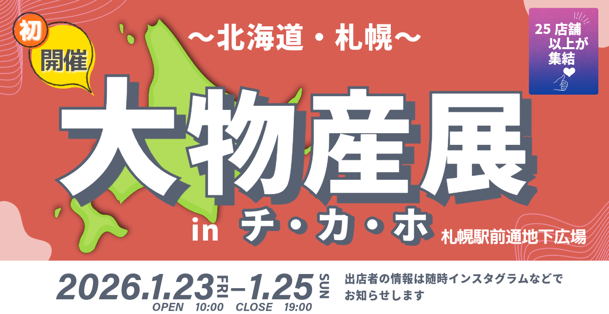 札幌食と観光国際実行委員会(本事業事務局:一般社団法人札幌物産協会)は、インバウンドや観光客であふれている絶好のロケーションである「チ・カ・ホ」のほぼ全ての空間を利用して、北海道産の素材を生かした食品を展示販売し、全国各地で行われている「北海道物産展」の雰囲気を創り、インバウンドや観光客、そして地元北海道・札幌の方々に北海道の食の魅力を発信するとともに、新たな需要、販路を拡大し北海道・札幌の食関連産業の振興に寄与すべく「北海道・札幌 大物産展inチ・カ・ホ」を開催いたします!